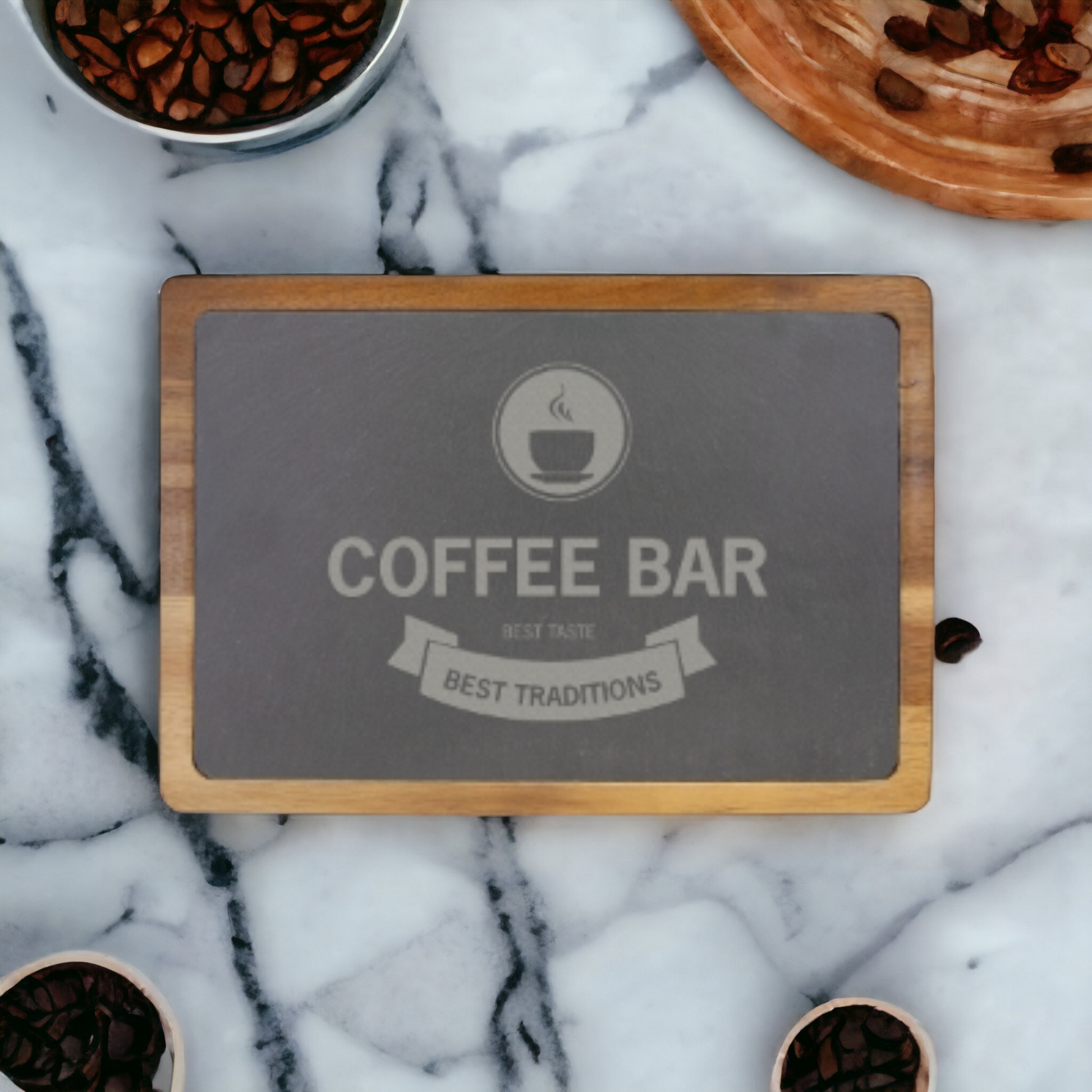 Cut your culinary masterpiece with style with these custom engraved ACADIA Wood/Slate Cutting/Serving Boards! Crafted from Acadia wood and featuring slate inserts and tools, this board will be the envy of any cooking enthusiast. Plus, your board can be personalized with custom engraving on the slate! (How cool is that?!).